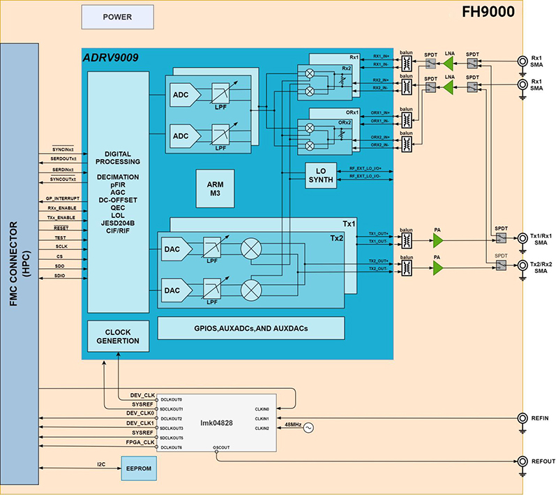 FH9000 is a high-performance, broadband, and highly integrated RF sub card based on the VITA57.1FMC architecture.The board is based on the agile transceiver ADRV9009 as the processing core, suitable for application in general software wireless Electric platform.